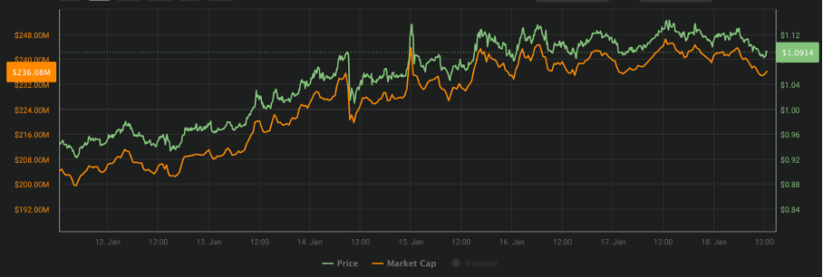 Kadena is only the 134th cryptocurrency based on market share, yet due to its stability and mineability, it is one of the most popular POW-based currencies. Over the past week, Kadena has risen from 0,9 USD to 1,09 USD, which is a 20% increase. In terms of market share, achieved a 15% increase, which also strengthens its position.